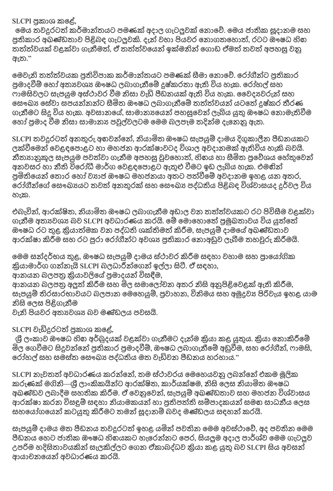 “අද පවතින මෙම පීඩනය හෙට ජාතික ඖෂධ හිඟයකට හැරෙන්නට පෙර, සියලුම අදාළ පාර්ශව මෙම ගැටලුව උපරිම හදිසිතාවයකින් සලකා බැලිය යුතුයි,” යනුවෙන් SLCPI සිය නිවේදනය මගින් අවසන් වශයෙන් අවධාරණය කර සිටී.