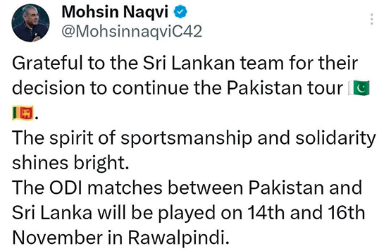 ආරක්ෂක හේතු නිසා ශ්රී ලංකා ක්රිකට් කණ්ඩායමේ සංචාරය අතහැර දැමීමේ තීරණය වෙනස් කිරීම ගැන පාකිස්තාන ක්රිකට් ආයතනයේ සභාපති මොහ්සින් නක්වි සහ හිටපු සුපිරි වේග පන්දු යවන ක්රීඩක ෂොයිබ් අක්තාර් ශ්රී ලංකා ක්රීඩකයන්ට ස්තුතිය පුද කර තිබේ.