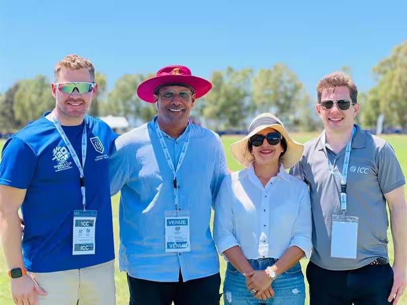 මේ ඡායාරූපයේ සිටින්නේ ඉතාලි ක්රිකට් සභාපතිනිය සහ ප්රභාත්, ජාත්යන්තර ක්රිකට් කවුන්සිලයේ නියෝජිතයන් වන ඇන්ඩි රයිට් (වමේ) සහ සෑම් විලියම්ස් (දකුණේ) ඡායාරූපයකට පෙනී සිටි අවස්ථාවකුයි.