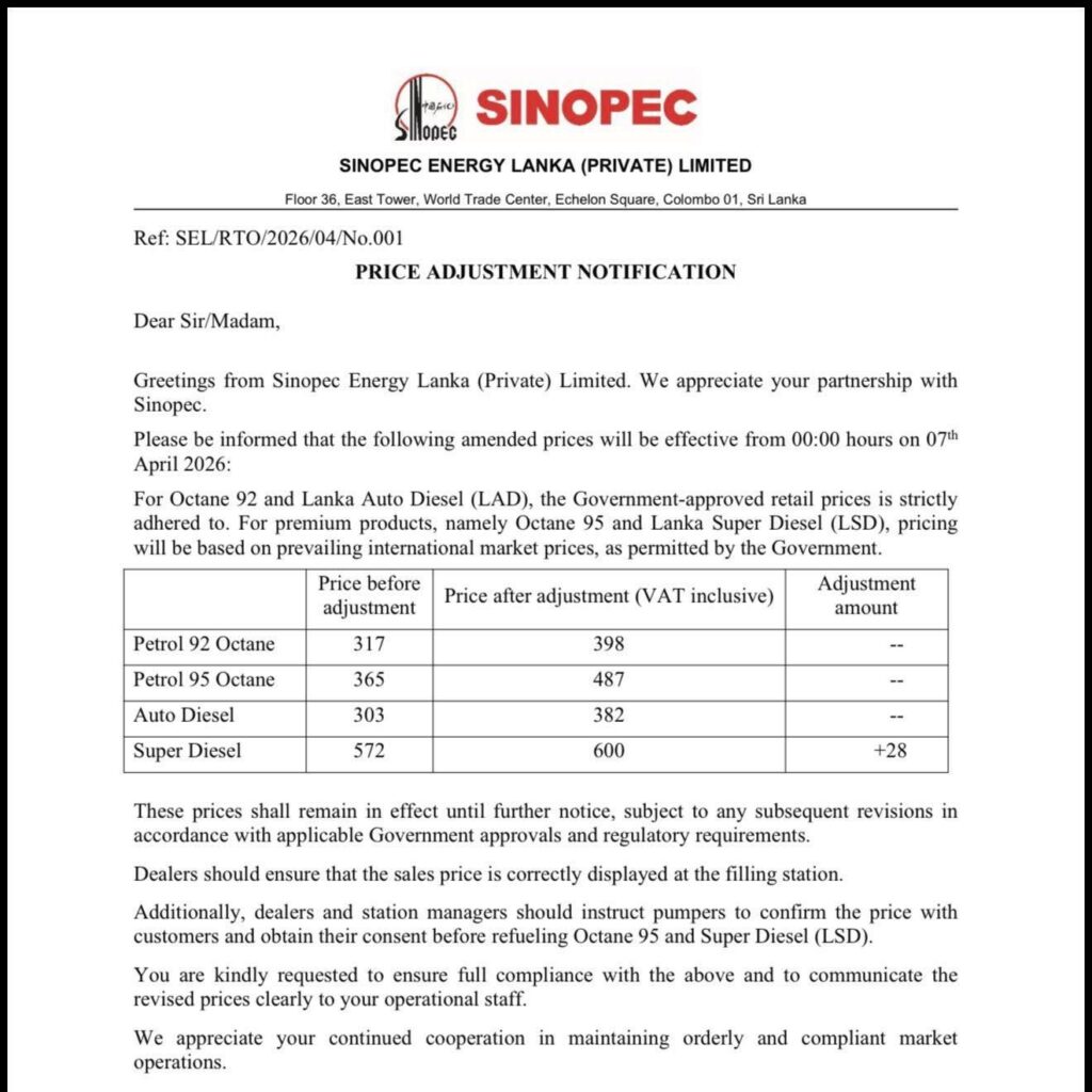 නිවේදනයක් නිකුත් කරමින් එම සමාගම වැඩිදුරටත් සඳහන් කළේ, ඔක්ටේන් 92 පෙට්රල් සහ ලංකා ඔටෝ ඩීසල් (LAD) රජය අනුමත කළ මිල ගණන් යටතේම අලෙවිකරන බවය.