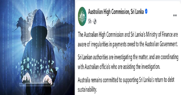 මුදල්, ක්රමසම්පාදන සහ ආර්ථික සංවර්ධන අමාත්යාංශයේ විදේශ සම්පත් දෙපාර්තමේන්තුවේ නිලධාරිනියක සහ නිලධාරියෙකුගේ ඊමේල් ගිණුම් හරහා හැකර්කරුවන් ඇතුළු වී සිදුකළ සොරකමක් සම්බන්ධයෙන් ඕස්ට්රේලියානු මහ කොමසාරිස් කාර්යාලය සහ ශ්රී ලංකා මුදල් අමාත්යාංශය දැනුවත්ව සිටින බව ඕස්ට්රේලියානු මහ කොමසාරිස් කාර්යාලය නිවේදනය කර තිබේ.