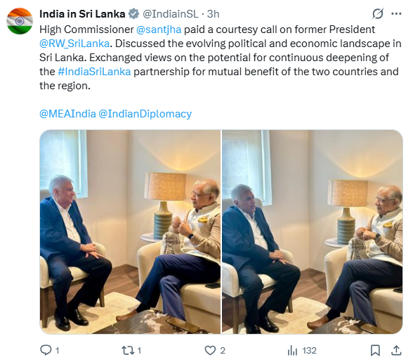කෙසේවෙතත් මෙරට ඉන්දීය තානාපති කාර්යාලය නිකුත් කළ X පණිවිඩයකින් දැක්වෙන්නේ මහකොමසාරිස්වරයා සහ හිටපු ජනාධිපතිවරයා ශ්රී ලංකාවේ දේශපාලන සහ ආර්ථික පරිණාමන තත්වයන් සම්බන්ධයෙන් සාකච්ඡාවක නිරත වූ බවත් ඉන්දු – ශ්රී ලංකා සබඳතා තවදුරටත් ගැඹුරට වර්ධනය කරගැනීමේ අවස්ථා ගැන අදහස් හුවමාරු කරගත් බවත් ය.