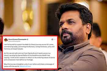 අද (21) සිට මෙරටින් නිල වශයෙන් ආරම්භ වන සාමයේ පා ගමන (Walk for Peace) වැඩසටහන සඳහා ජනාධිපති අනුර කුමාර දිසානායක මහතා සිය පූර්ණ සහයෝගය පළ කර ඇත.