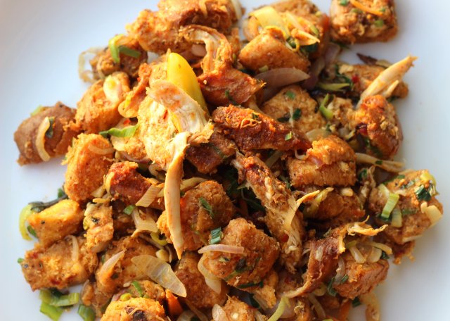 • ඔබ ගත් මස් වර්ගය (සැමන් හෝ සොසේජස් වැනි දෙයක් ද භාවිත කරන්න පුලුවනි) කුඩාවට කපා ෆ්‍රයි කරගන්න.