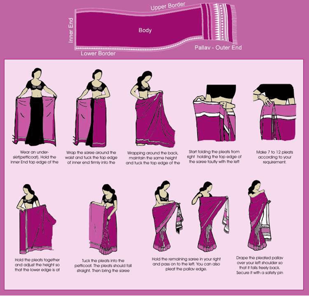 නිවැරදිව සකසා ගත් විට සිල්ක් සාරියක් ඇඳීම මඳක්වත් අපහසු නැහැ.මේ පහත රූප සටහන ඔබට ඒ පියවර වඩාත් හොඳින් පැහැදිලි කරන්නට සමත් වේවි.
