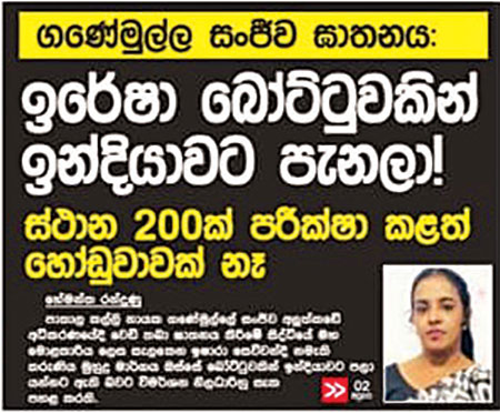 ගණේමුල්ලේ සංජීව නමැති පාතාල නායකයා කොළඹ අලුත්කඩේ අධිකරණ සංකීර්ණයේදී වෙඩි තබා ඝාතනය කිරීමේ සැලසුමේ මහ මොළකාරිය ලෙස සැලකෙන ඉෂාරා සෙව්වන්දි නේපාලයේ බක්තපූර් දිස්ත්රික්කයේ තිබ්බස් පාර්ක් ප්රදේශයේ සුඛෝපභෝගී නිවසක සැඟවී සිටියදී පෙරේදා (13 වැනිදා) රාත්රියේ අත්අඩංගුවට ගන්නා ලදී.