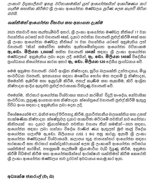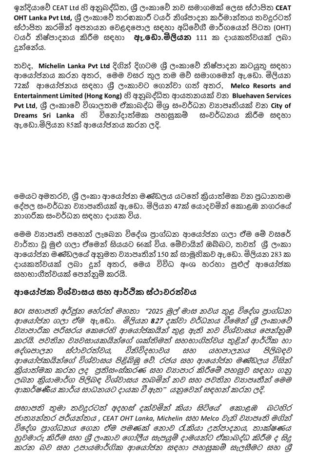 මීට අමතරව, 2025 පළමු මාස නවය තුළ ආයෝජන මණ්ඩල ව්යාපෘති 163 කින් ඩොලර් මිලියන 326 ක දේශීය ආයෝජනයක් ද සිදු කරන ඇති බව එම නිවේදනයේ දැක්වේ.