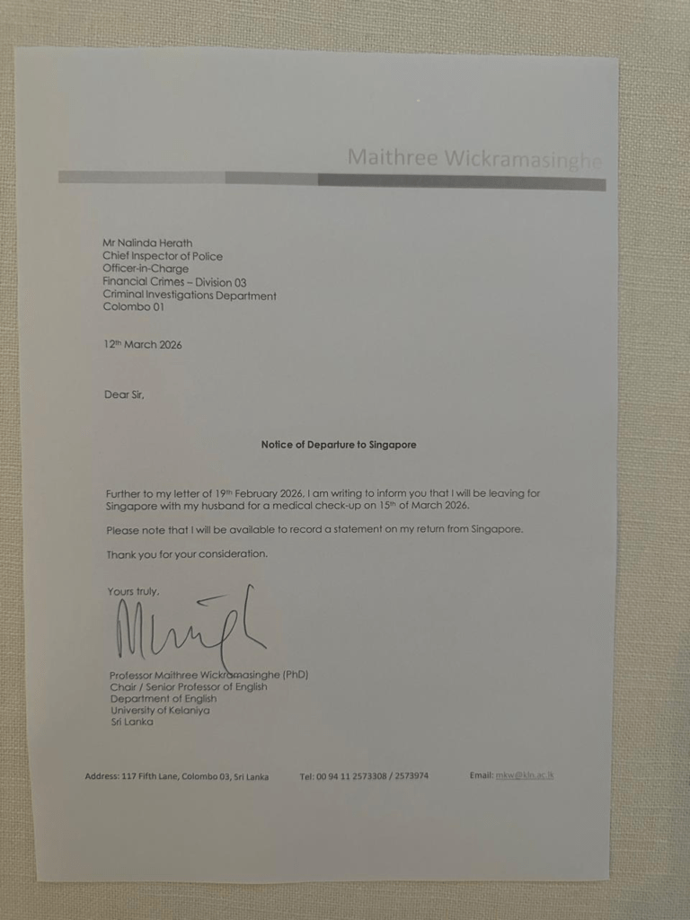 එසේ තම සෞඛ්‍ය තත්වය පිළිබඳ විස්තර සහිතව මෛත්‍රී වික්‍රමසිංහ මහත්මිය කරන ලද ඉල්ලීම සානුකම්පිතව සලකා බලා ඇයගේ ප්‍රකාශය අදාළ නිවසේදී සටහන් කරගැනීමට CIDය කටයුතු කර තිබුණු අතර ඒ සම්බන්ධයෙන් මෛත්‍රී වික්‍රමසිංහ මහත්මිය සිංගප්පූරුව බලා යාමට පෙර CIDයට එවූ ලිපියක් සහ CIDය අප්‍රේල් 20 වනදා ඇයට යොමුකළ ලිපියක් පහතින් දැක්වේ.