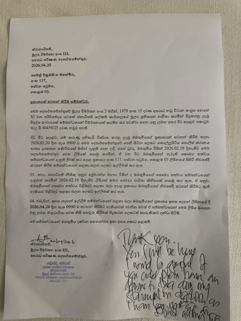 කෙසේවෙතත් CID නිලධාරීන් අදාළ ප්‍රකාශය ලබාගැනීම සඳහා වික්‍රමසිංහ මහතාගේ නිවසට ගොස් තිබුණේ මෛත්‍රී වික්‍රමසිංහ මහත්මිය ලිඛිතව කර තිබුණු ඉල්ලීමක් අනුව ය.