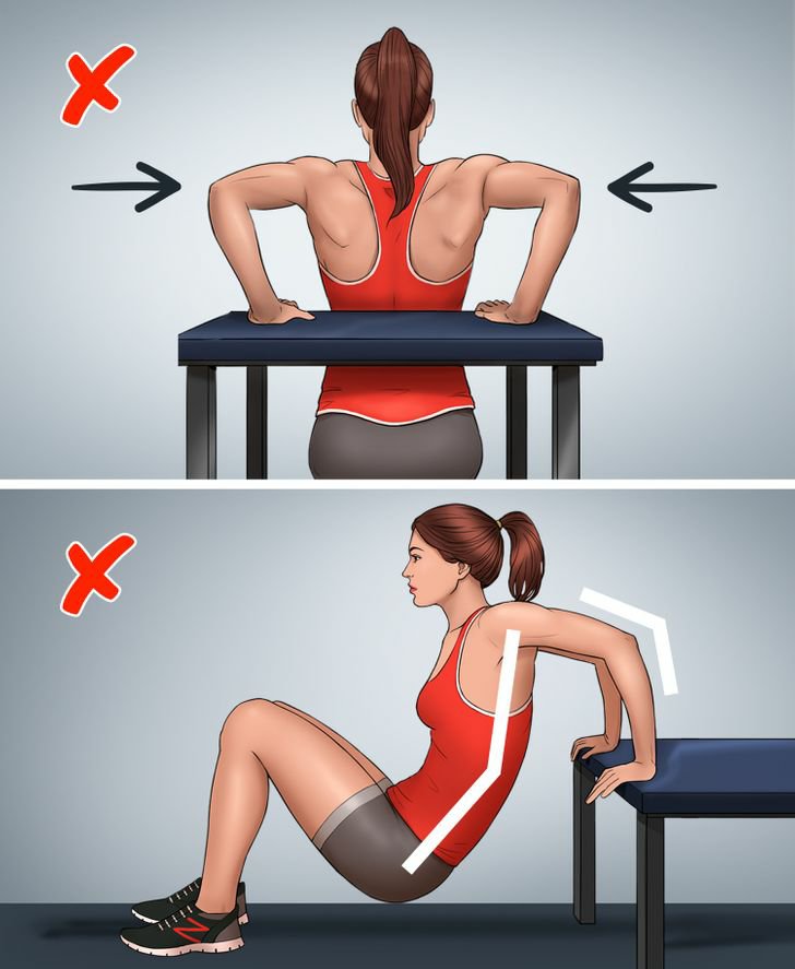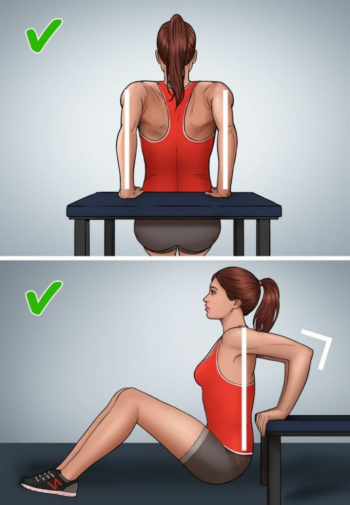 මේ Execrise එක මූලික ව්‍යායාමයක් වන අතර එය ආරම්භකයින් සඳහා සුදුසුයි. ශරීරයේ ඉහළ කොටස මේ සඳහා යොදා ගන්නවා. බංකුවක හෝ පුටුවක ආධාරයෙන් සිදු කළ යුතු නමුත් යම් මට්ටමක පුහුණුවෙන් පසු ඔබට බිම සිට Dips Execrise එක කරන්න පුලුවන්