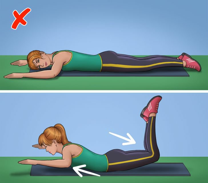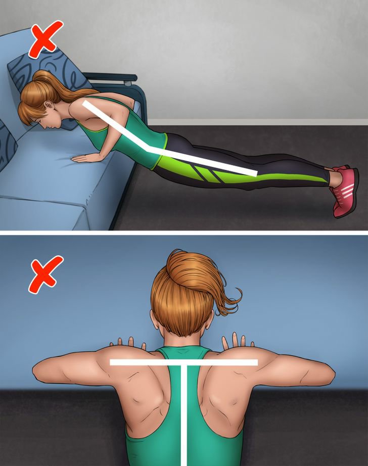 මේ රූපයේ දැක්වෙන ආකාරයේ වැරදි ඔබ අතින් වුණොත් කොඳු ඇට පෙළට හානි වෙන්න පුලුවන්. ඒ වගේම ව්‍යායාමය නිසියාකාරව වෙන්නෙත් නැහැ.