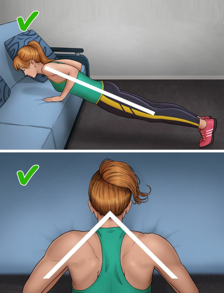 • ඔබේ අත් බිම, සෝෆා හෝ බිත්තියක් මත තබන්න. ඔබේ ශරීරය නූලක් මෙන් කෙළින් තබාගෙන හැකි තරම් පහත් කරන්න.