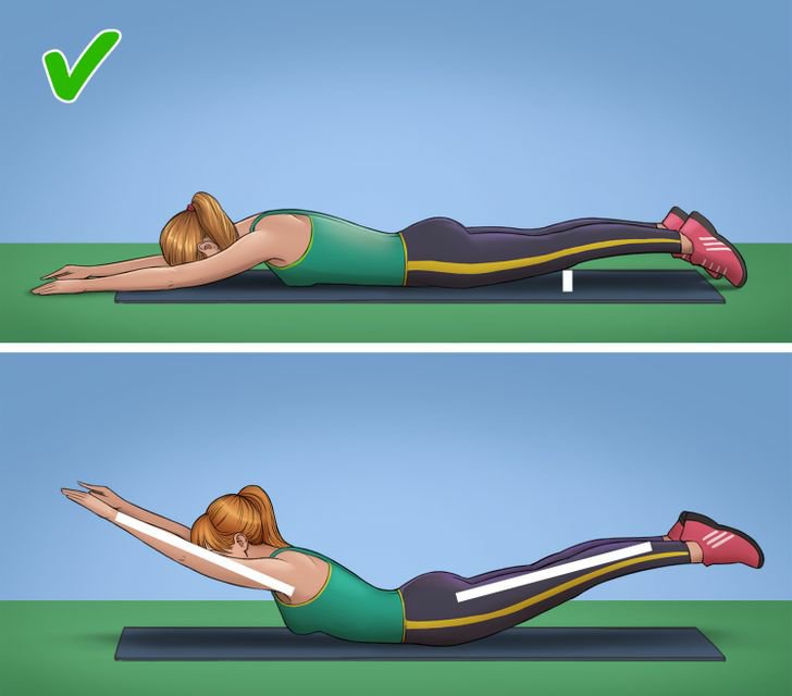 • ඔබේ අත්, පපුව සහ කකුල් බිමෙන් ඔසවන්න. සෙමින් ඒවා ඉහළට ඔසවා තත්පර 2-4 ක් තබා ගන්න.