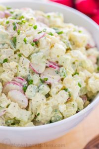 අල සිහින්ව පෙති කපා ගන්න. ලූනු, ලුණු, ගම්මිරිස් සමග හොඳින් මිශ්ර කර, සෝස්, පාස්ලි සහ විනාකිරි මිශ්ර කර අල පෙති පොඩි නොවන සේ අල වලට කලවම්කරන්න.